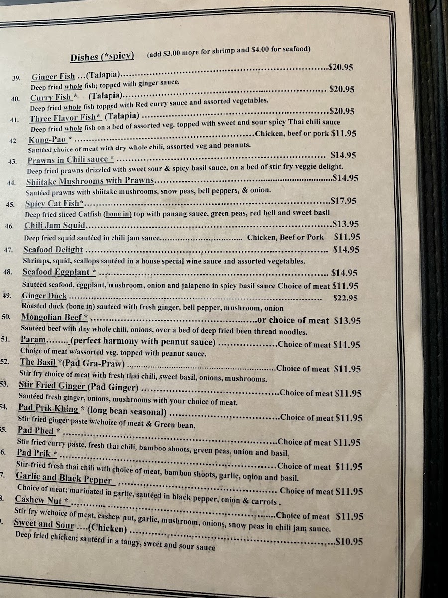 Soups are available in clear broths with ingredients like chicken wontons, assorted vegetables, seafood, and Thai spices. Main dishes highlight classic Thai curries like red curry, green curry, Panang curry, and yellow curry, often available with chicken or other proteins. Rice dishes, such as Thai fried rice and shrimp basil rice, provide additional meal choices.